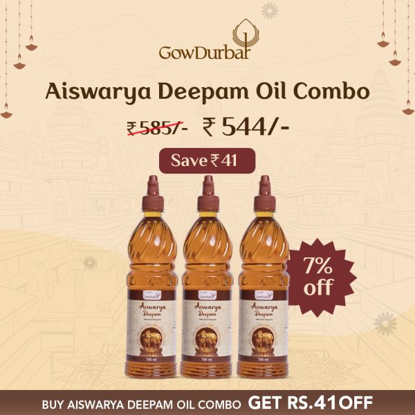 Aiswarya Deepam sacred oil emerged as a one-stop solution based on vedic scriptures. It is cultivated with indigenous cow ghee, 100% natural oils derived from sesame, grain, coconut, and mahua flowers blended with medicinal herbs such as tulsi, cloves, and camphor extracts in proportions prescribed by ancient formula’s.