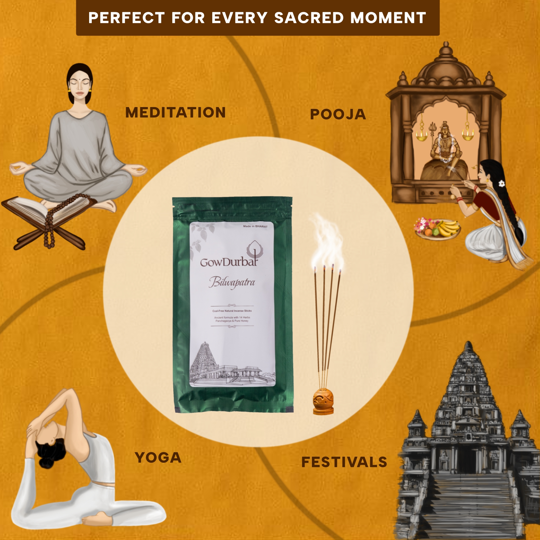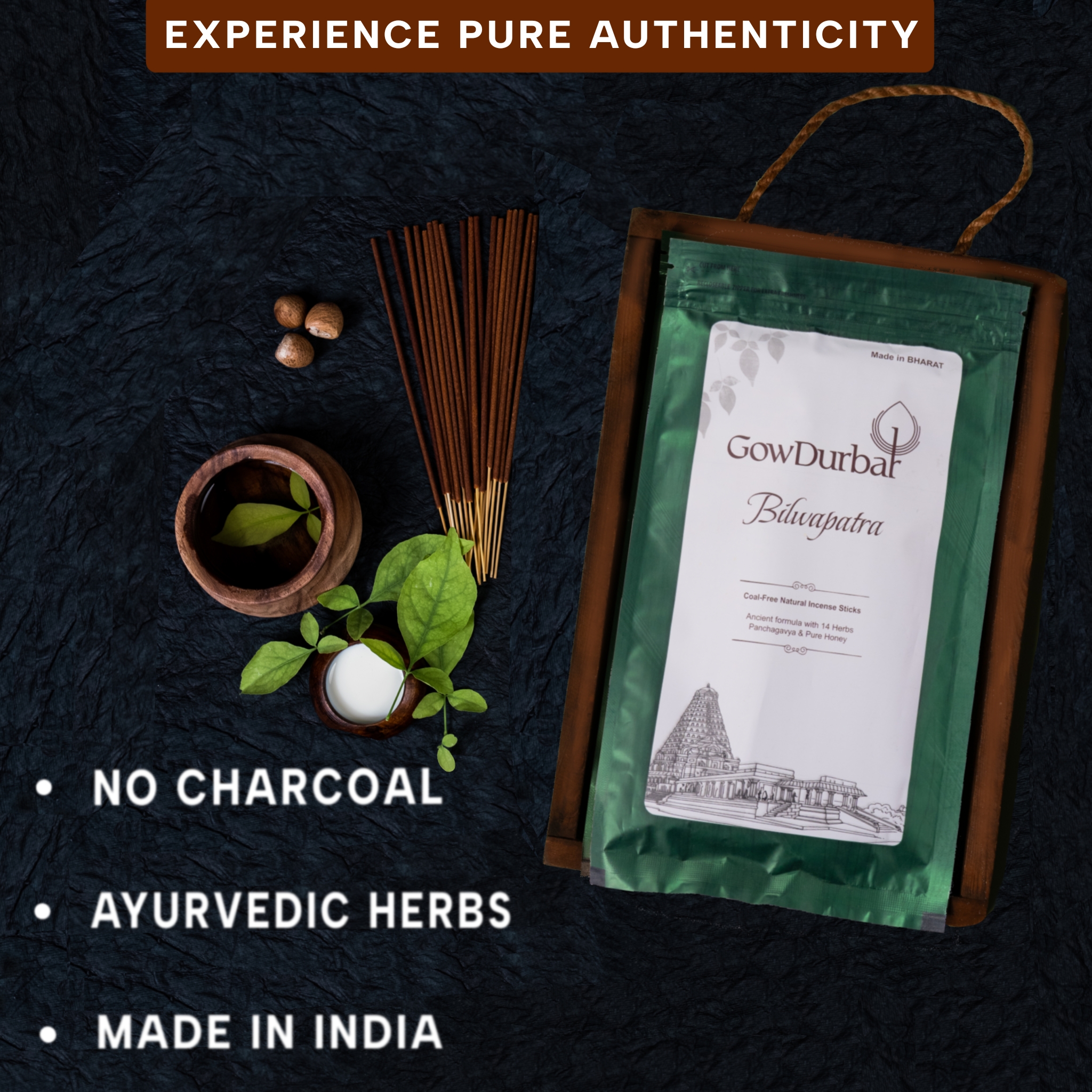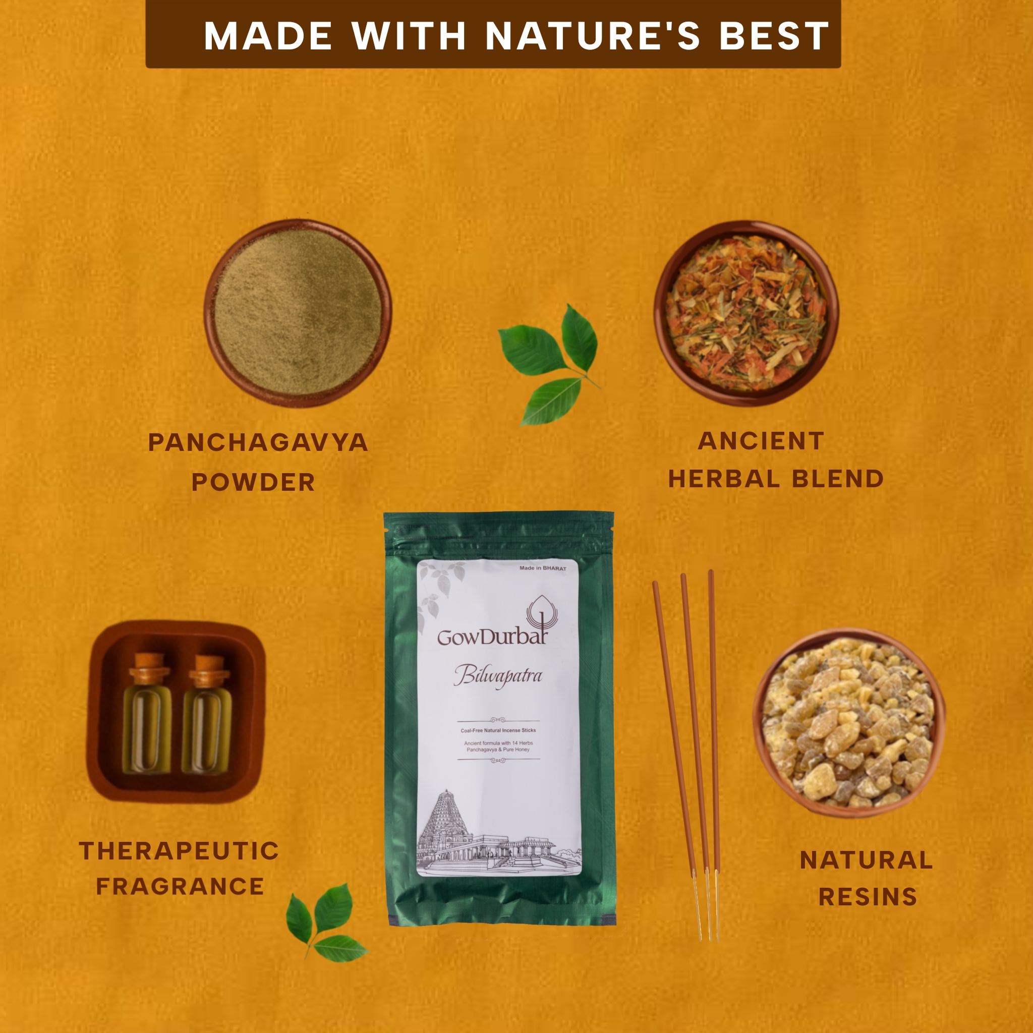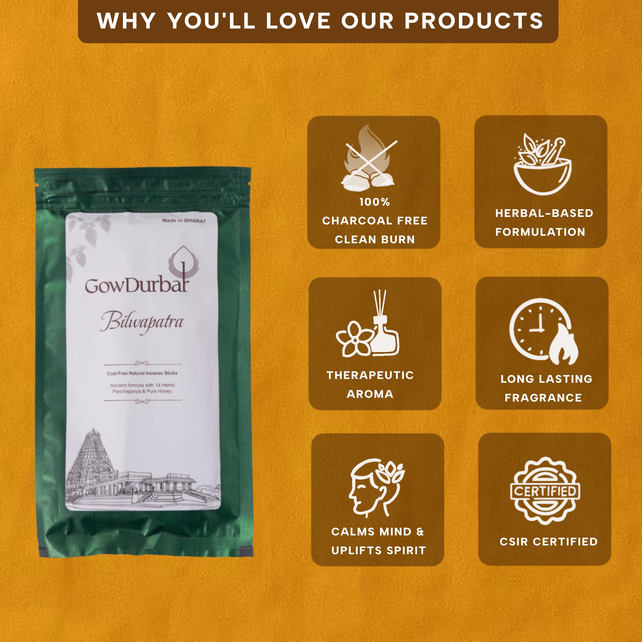 Our Bilwa-Patra incense sticks are formulated from organically cultivated roots and herbs. Their unique ingredients include 100% natural wood powder, panchagavya (indigenous cow derivatives), and a soothing fragrance from aromatic plant extracts. This ancient formula helps to create a stress-free mind and a pleasant environment, as well as purify your home..