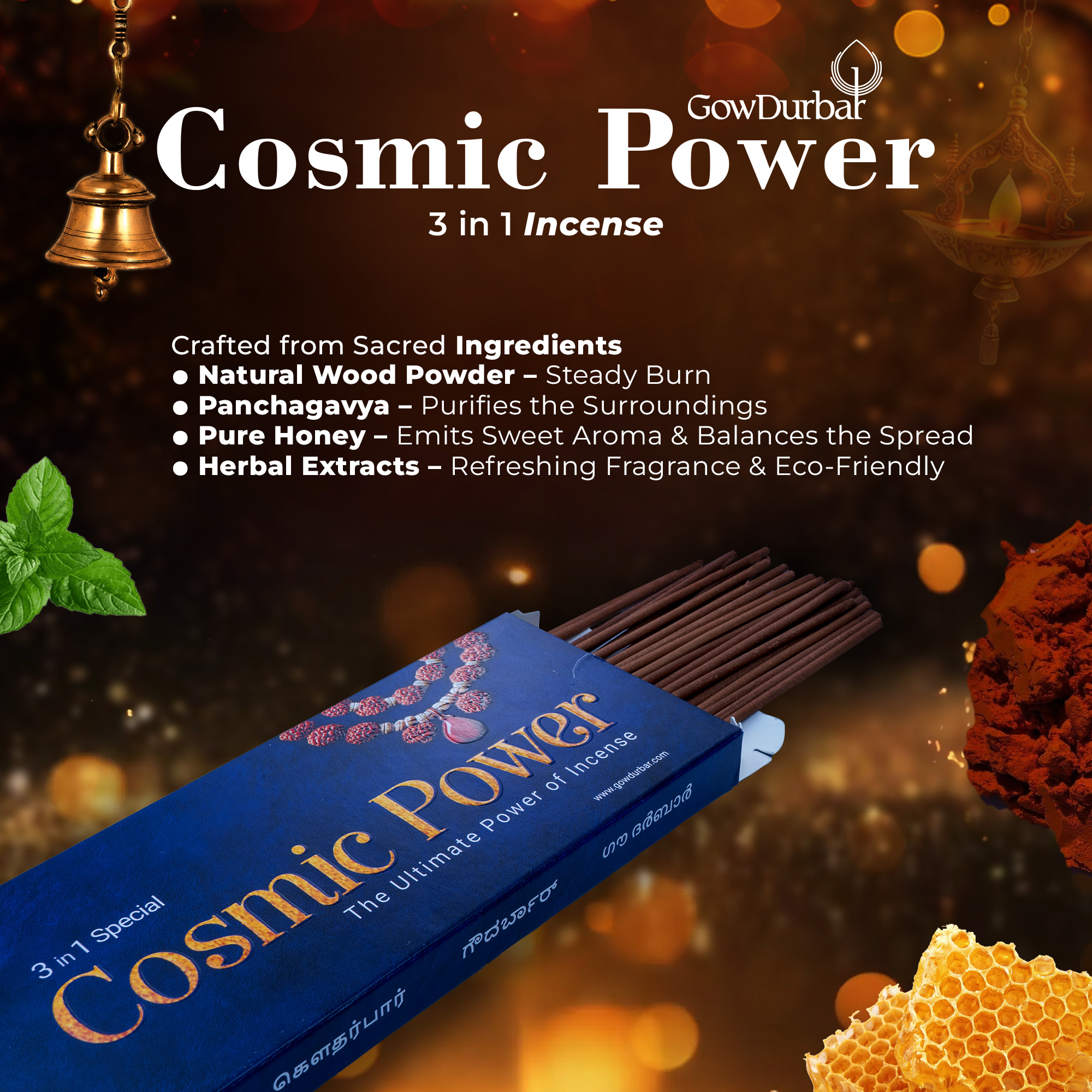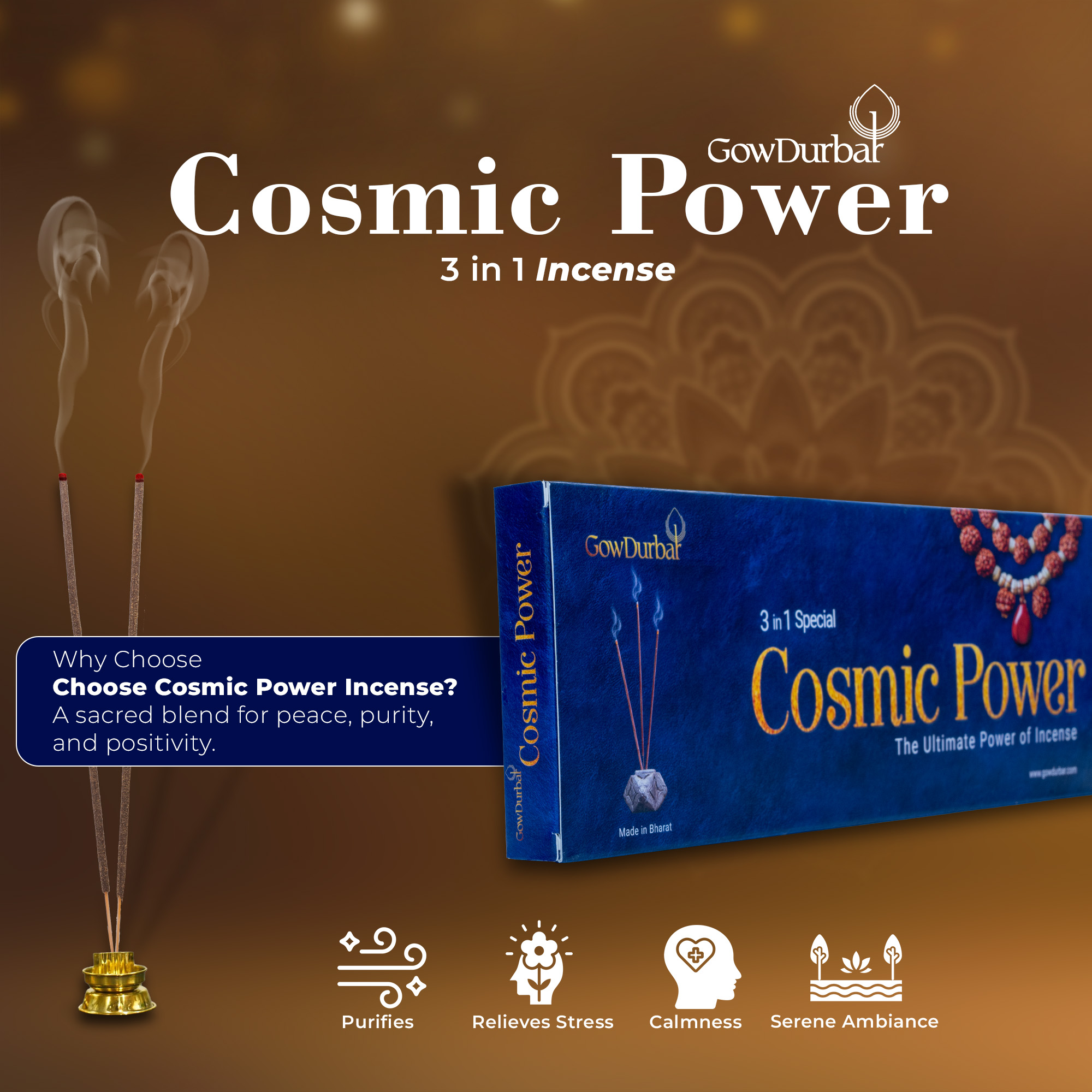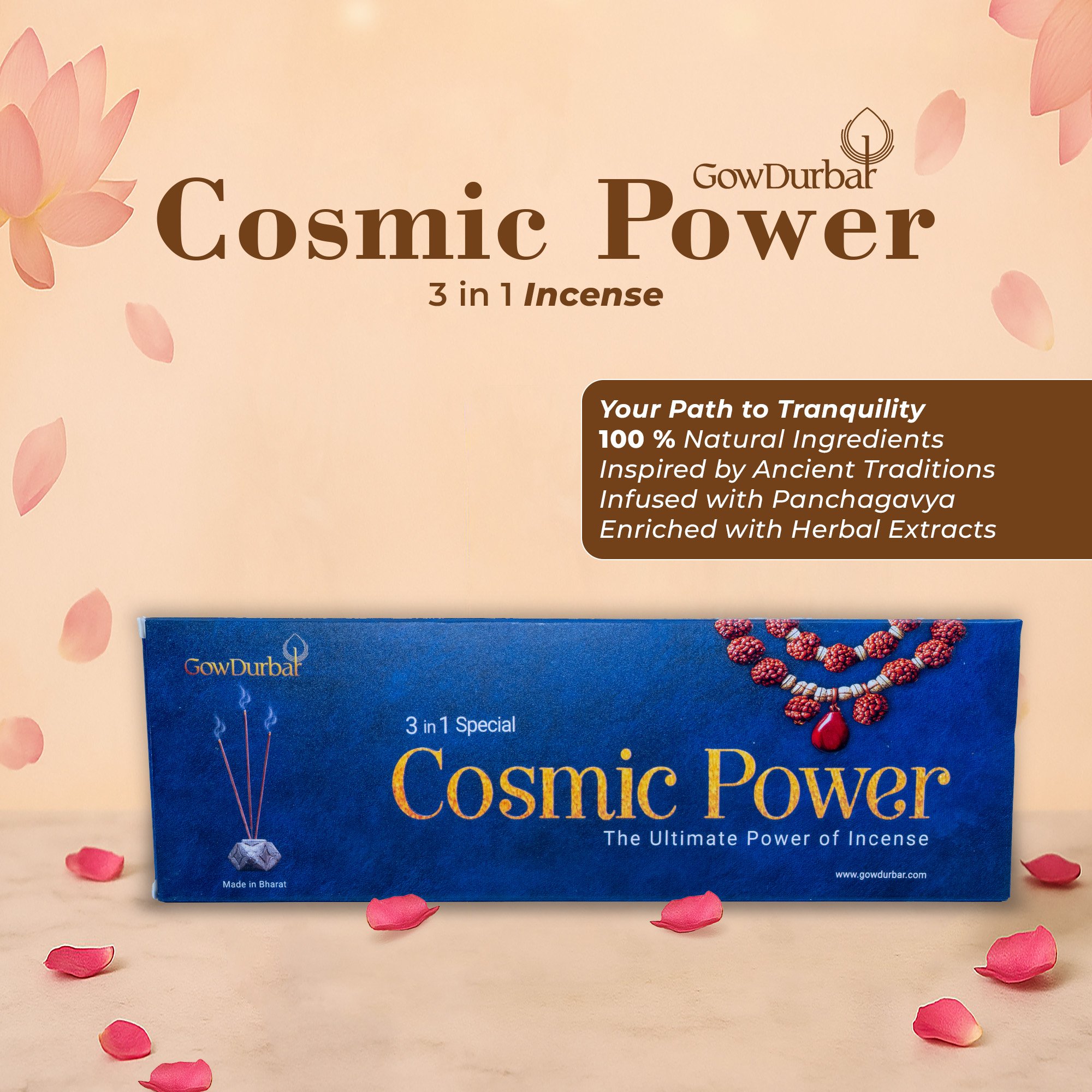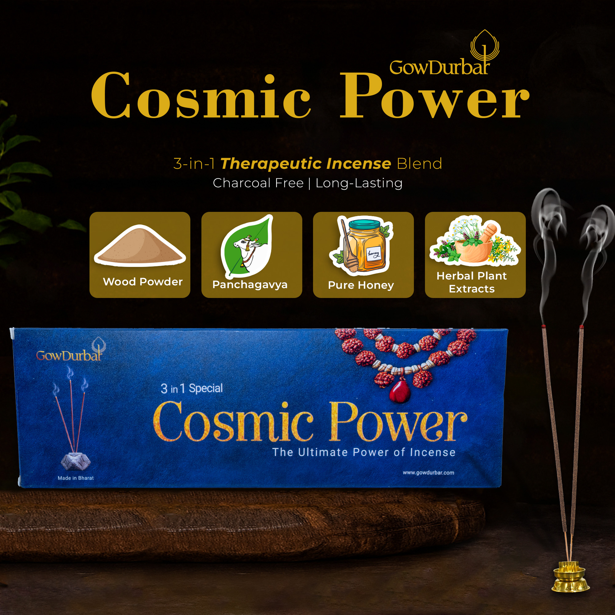 Our 3-in-1 Therapeutic Cosmic Power Incense Sticks are crafted from organically cultivated roots and herbs, featuring 100% natural wood powder. Infused with Panchagavya (sacred indigenous cow derivatives) and enriched with the soothing essence of aromatic plant extracts, this ancient blend purifies your home while fostering a stress-free mind and a serene environment.