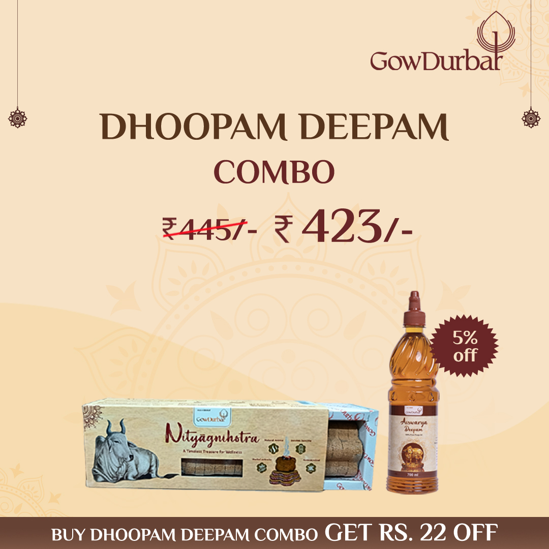 Nityagnihotra Dhoop and Aiswarya Deepam Oil combine to create a serene and spiritually uplifting pooja experience with the GowDurbar Dhoopam-Deepam pack. The dhoop is crafted from 16 natural herbs, indigenous cow-derived Panchagavya, and medicinal tree bark powders, designed to purify your space, dispel negative energies, and foster a sacred atmosphere. The oil is refined via a careful four-stage purification process infused with the natural essences of Tulasi and Camphor, creating a soothing devotional ambiance for prayer and meditation.