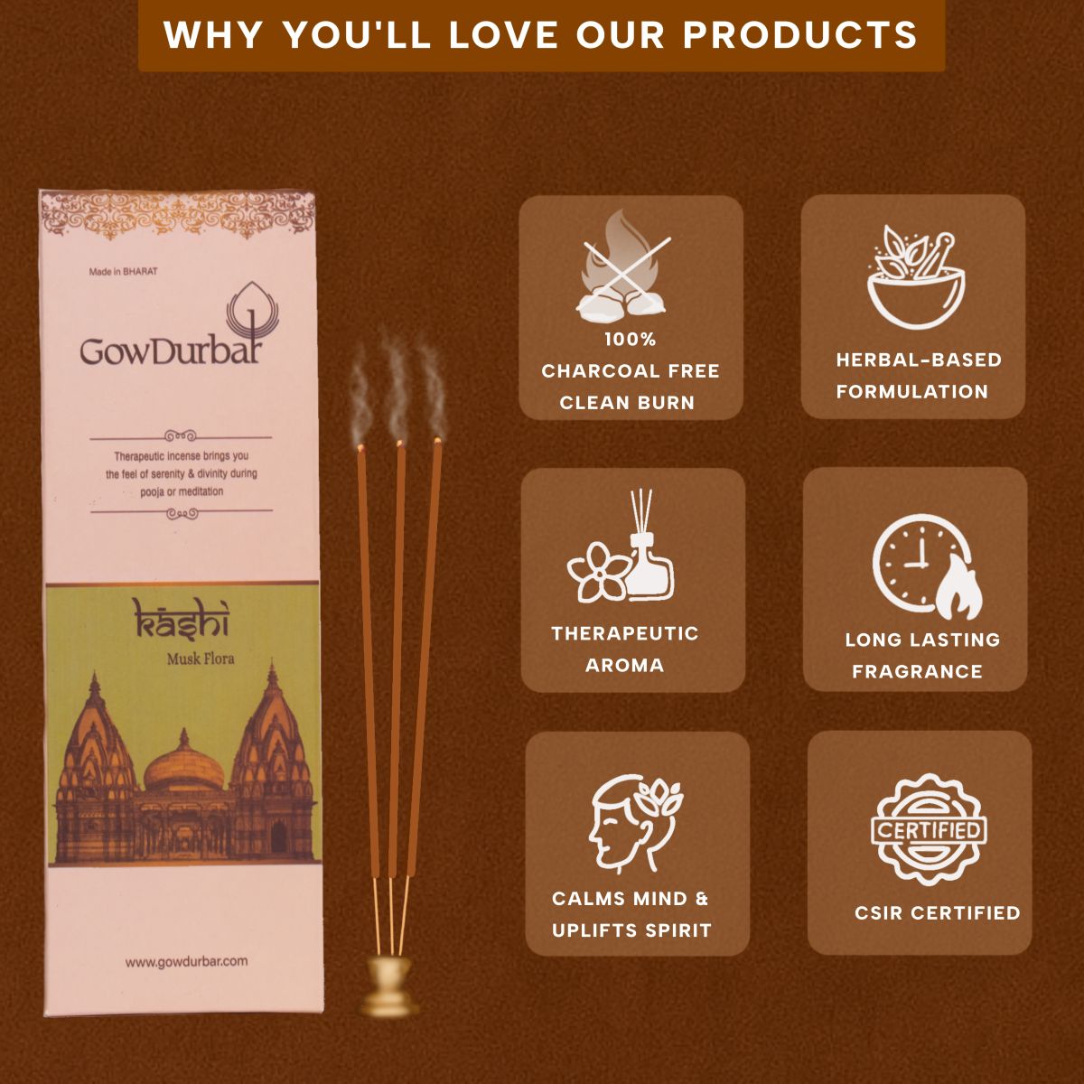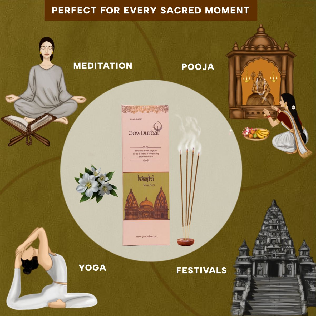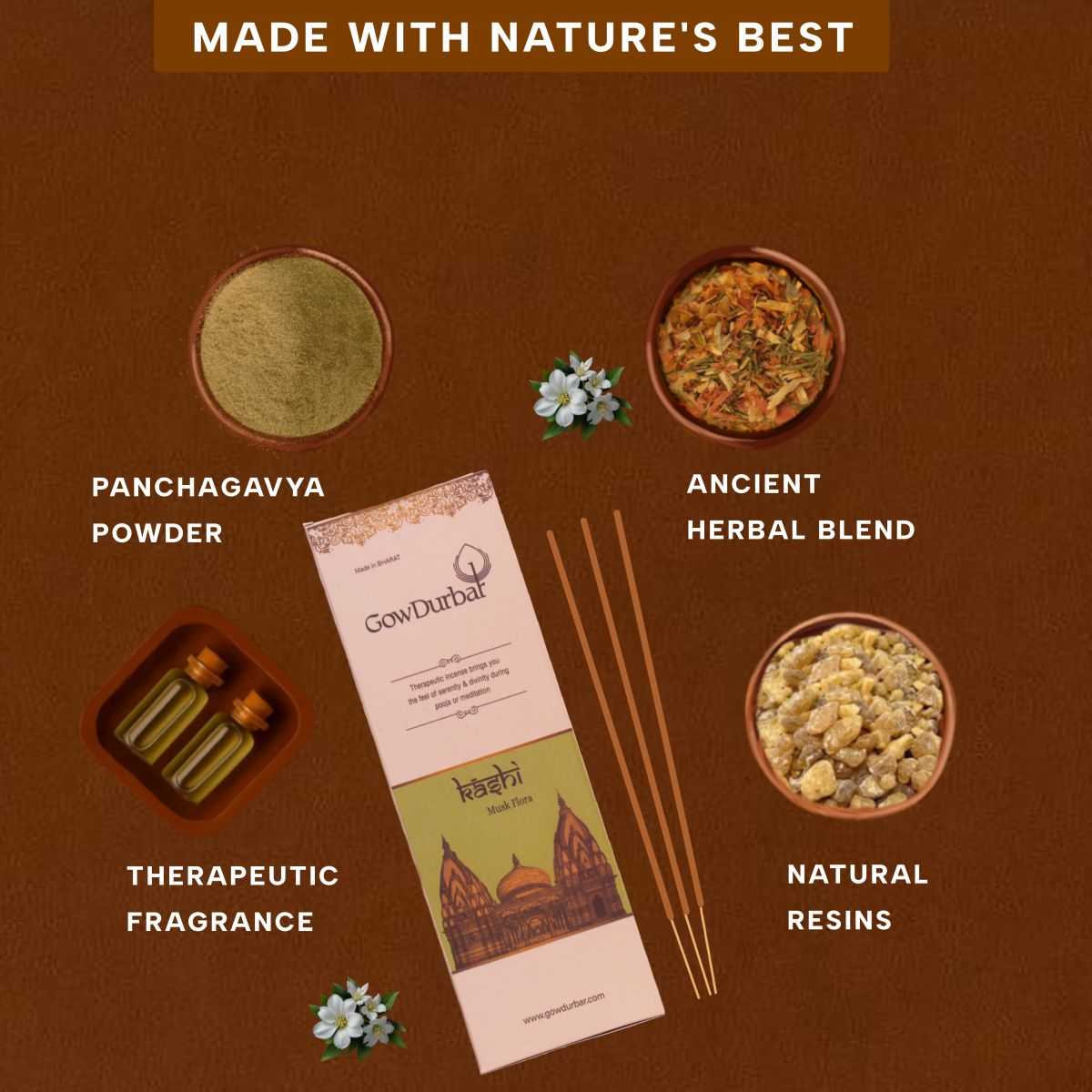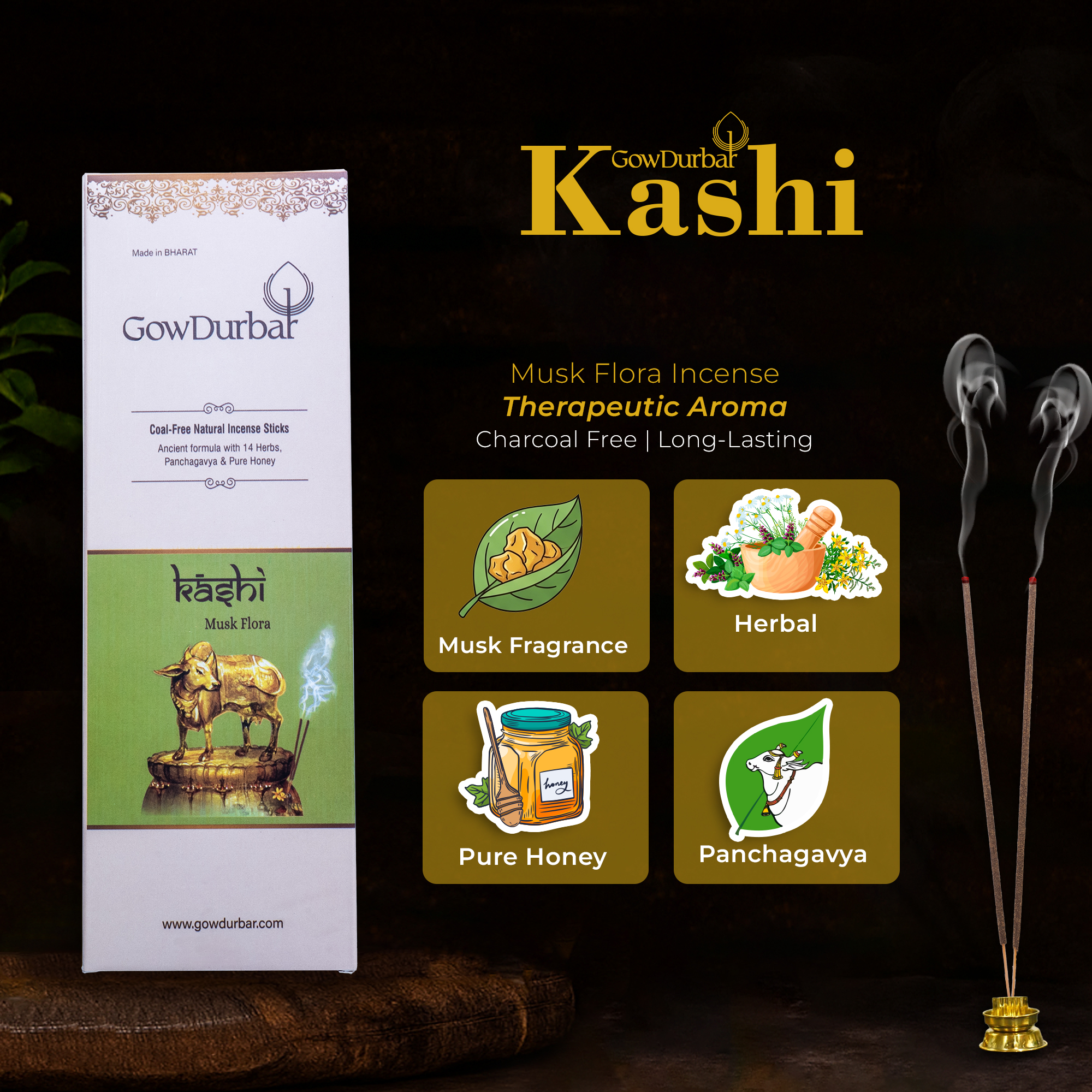 The Incense is named after Holy City, ” Kashi ” which is revered as one among seven Liberation cities in Indian culture. In Hindu tradition, seven places are considered as utmost sacred & believed to result in liberation (moksha) just by visiting once in a lifetime. Uttering those city names itself is highly regarded. Our Musk Flora Incense is made such that you would experience the vibes of consecrated place, Kashi at your doorstep.