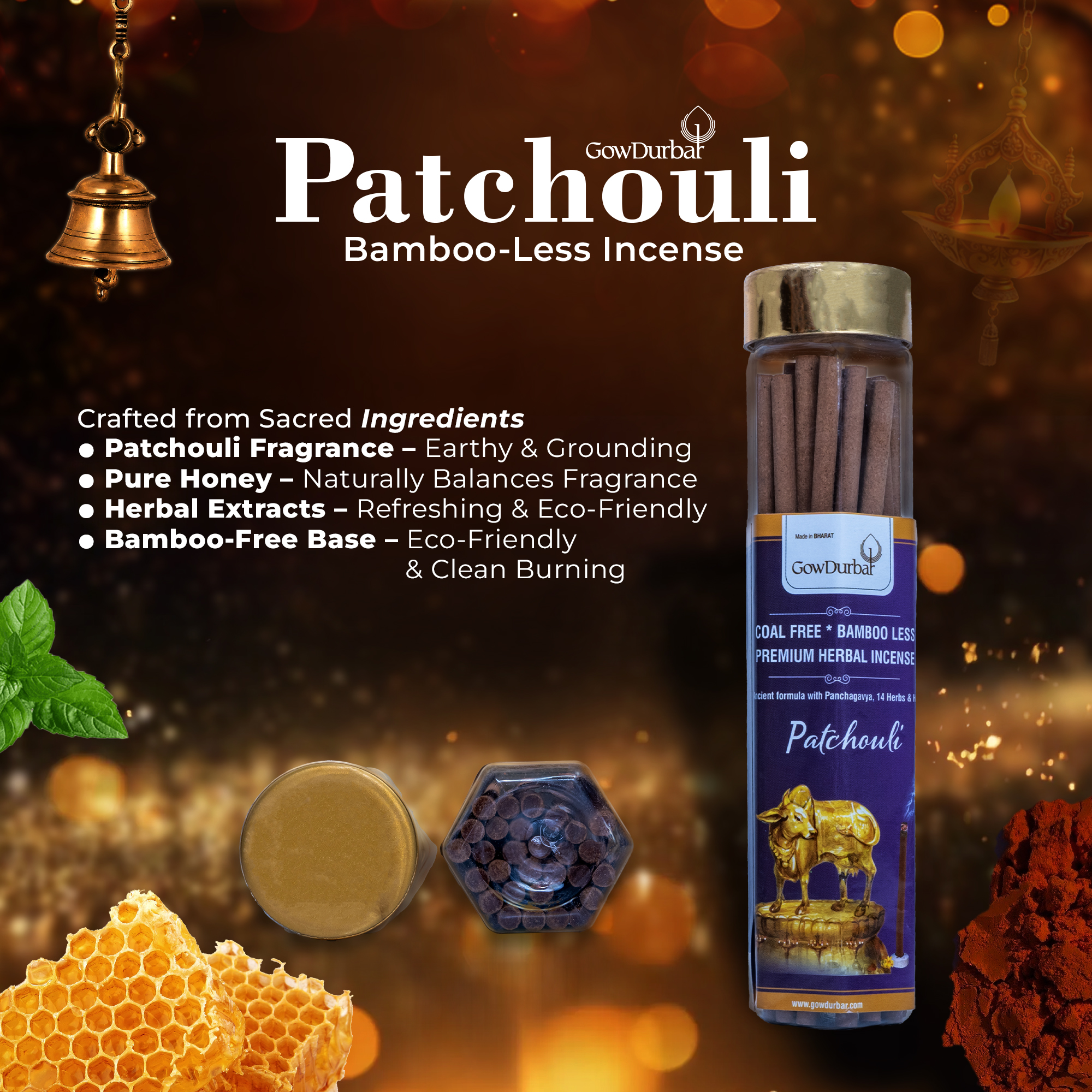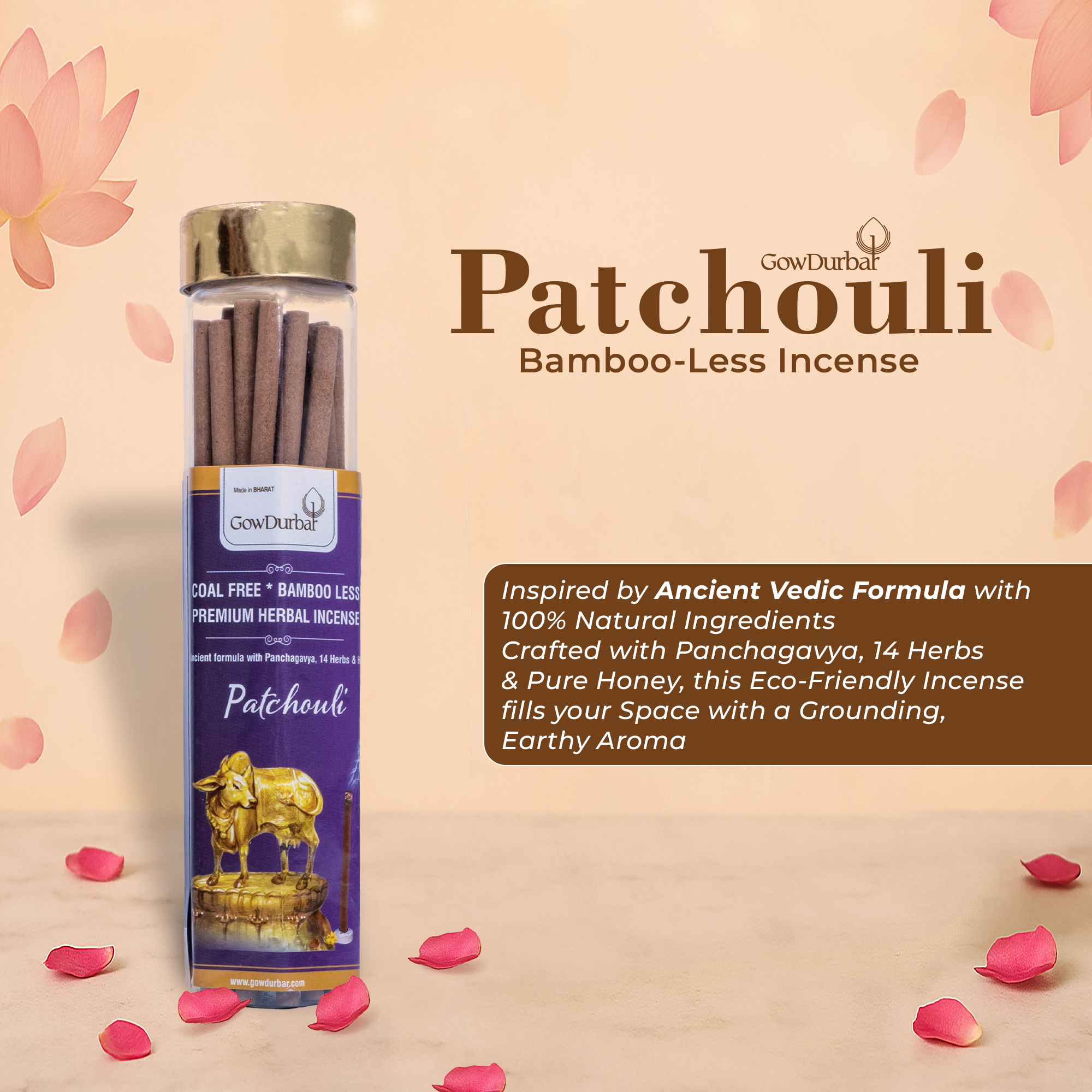 Introducing Patchouli, an eco-friendly, bamboo-less incense created with nature’s touch. Formulated with Panchagavya, 14 herbs, and pure honey, it exudes a distinct fragrance. At Gowdurbar, our commitment lies in crafting eco-conscious, soul-stirring products for heightened spiritual experiences.