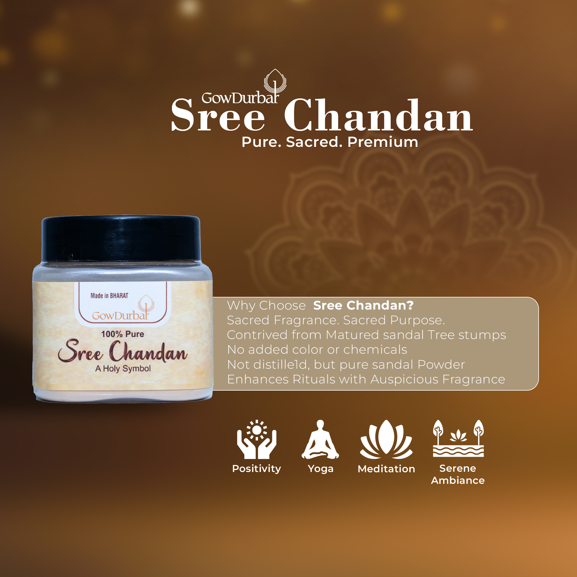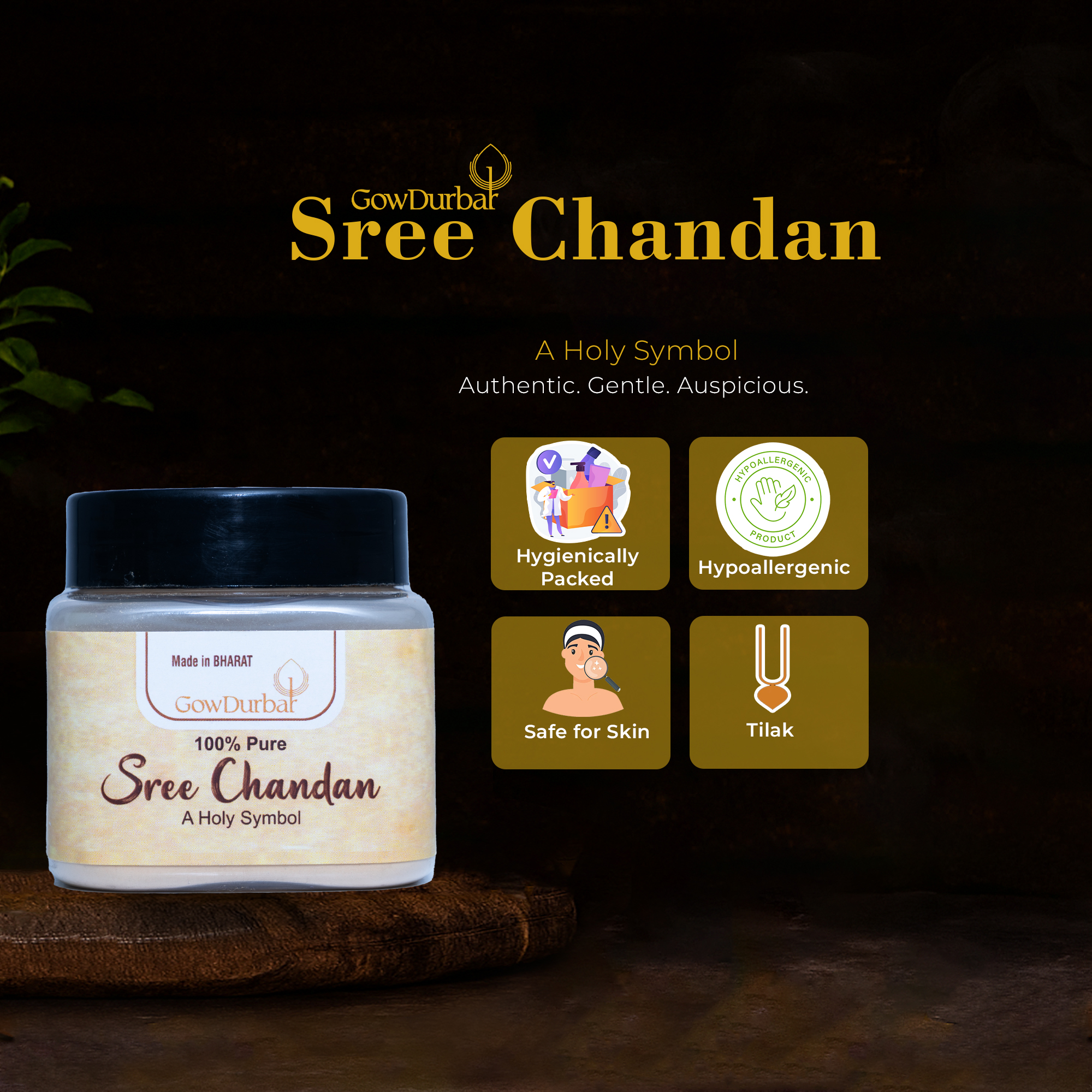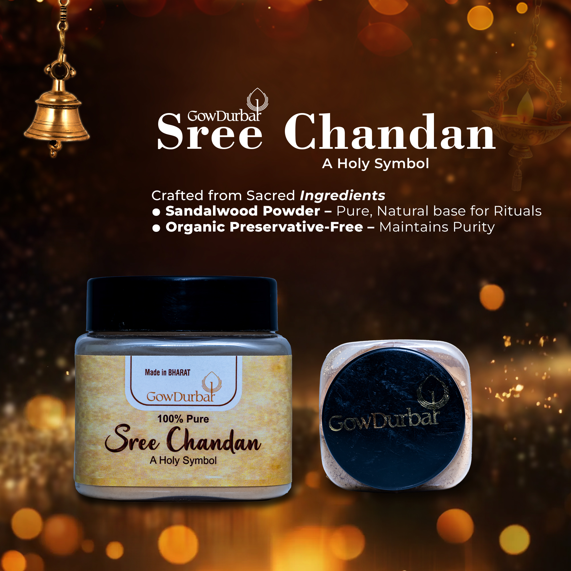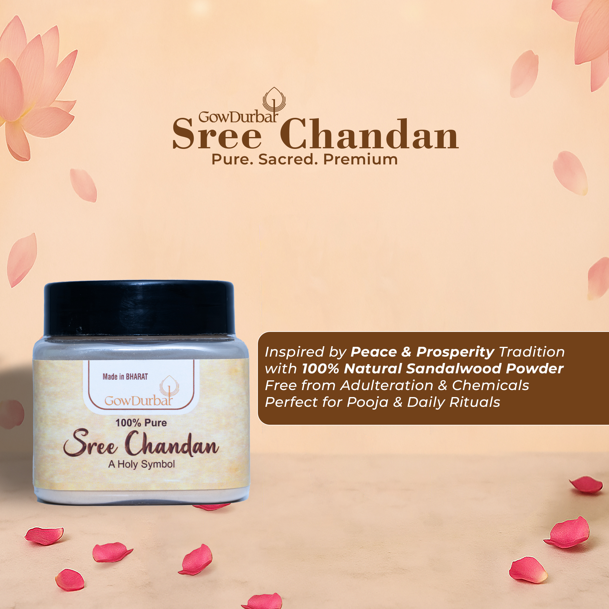 Sree Chandan is a premium sandalwood powder prepared from naturally matured sandal stumps, free from adulteration and added colors, crafted to sanctify daily pooja, tilak, homa, and festival rituals with a pure, cooling fragrance and auspicious presence. Gentle on skin and suitable for regular tilak, it lends serenity to worship spaces and supports meditative focus with its calm, classic chandan aroma.