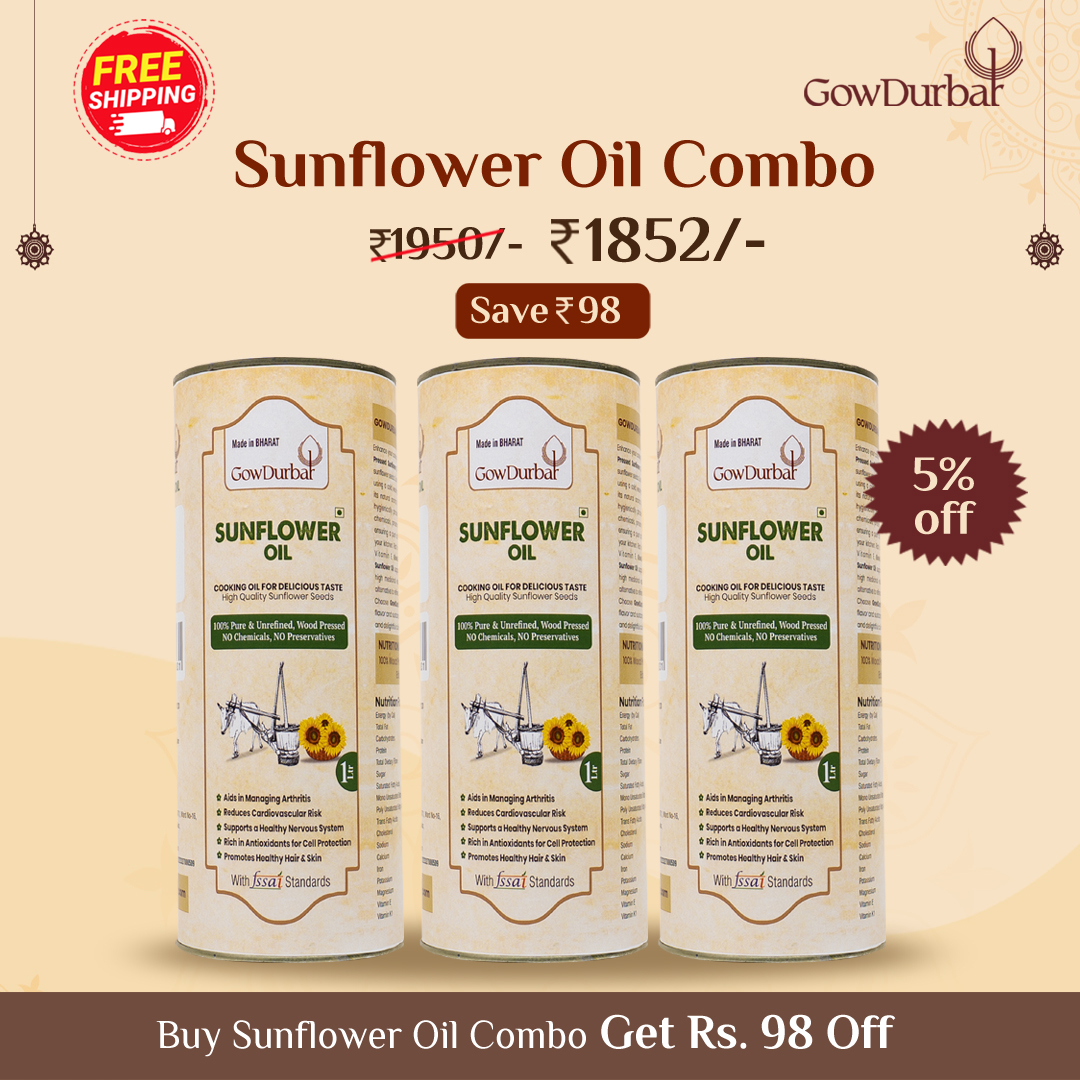Light, clean wood‑pressed sunflower oil extracted in a slow lakdi‑ghani from carefully chosen seeds, delivering a neutral aroma, bright taste, and crisp mouthfeel that keeps masalas and vegetables front‑and‑center in everyday Indian cooking perfect for tadkas, sautéing, baking, and occasional frying while remaining unrefined, traditionally filtered, and free from chemical additives or preservatives. This kitchen‑friendly staple is positioned for purity, clarity, and consistent performance across daily meals and meal‑prep routines.