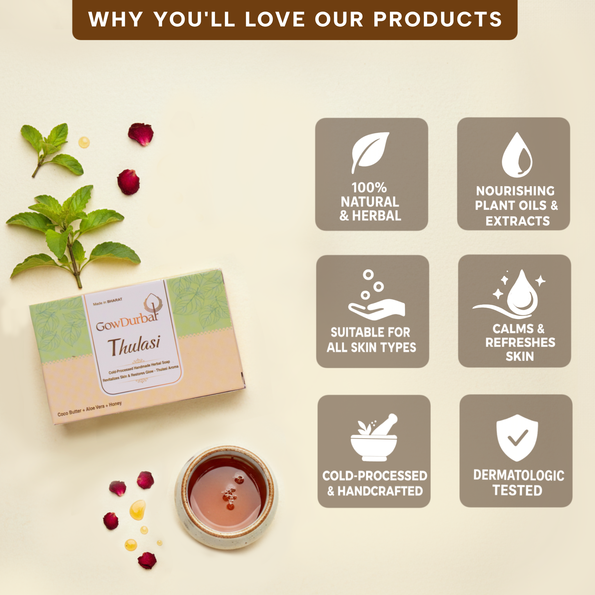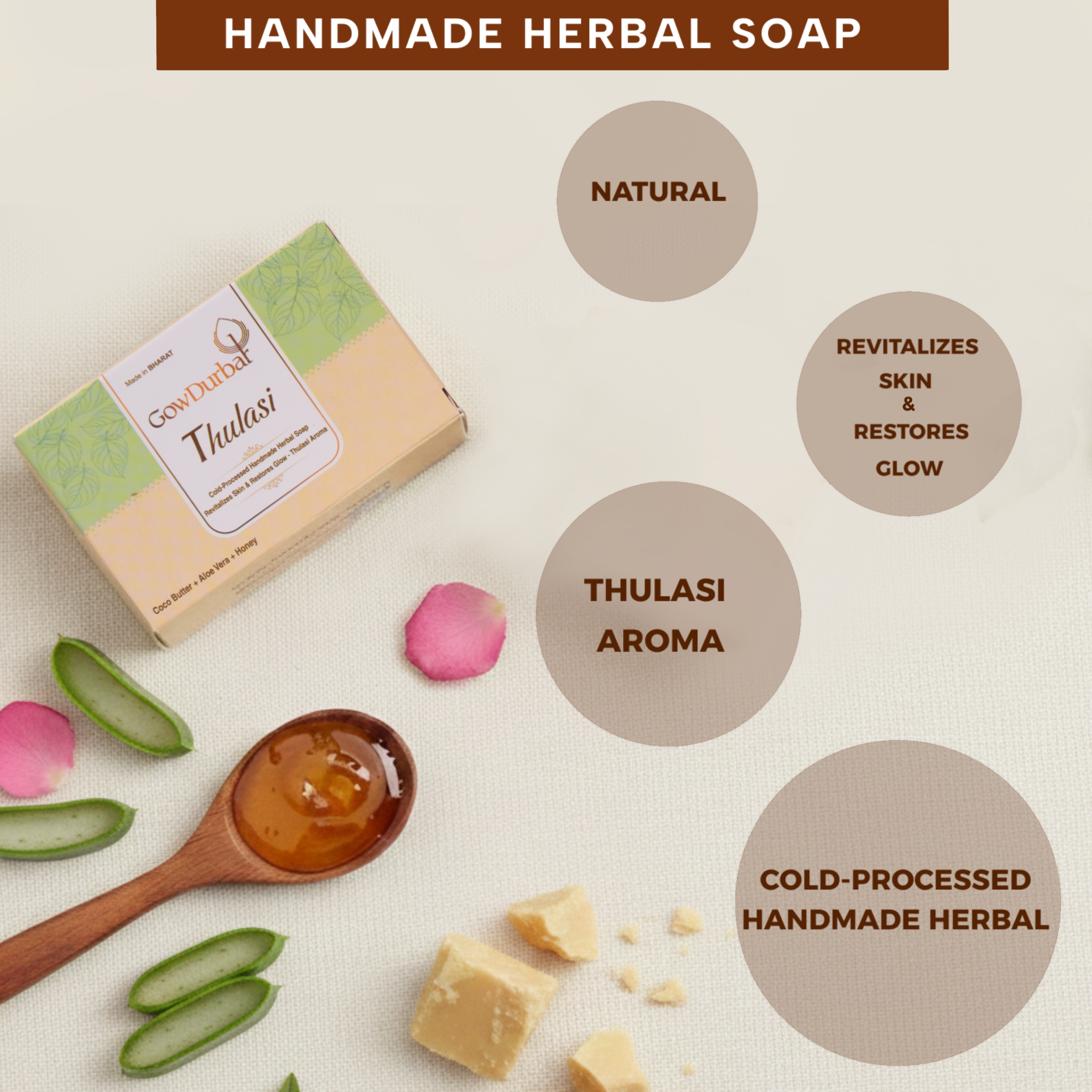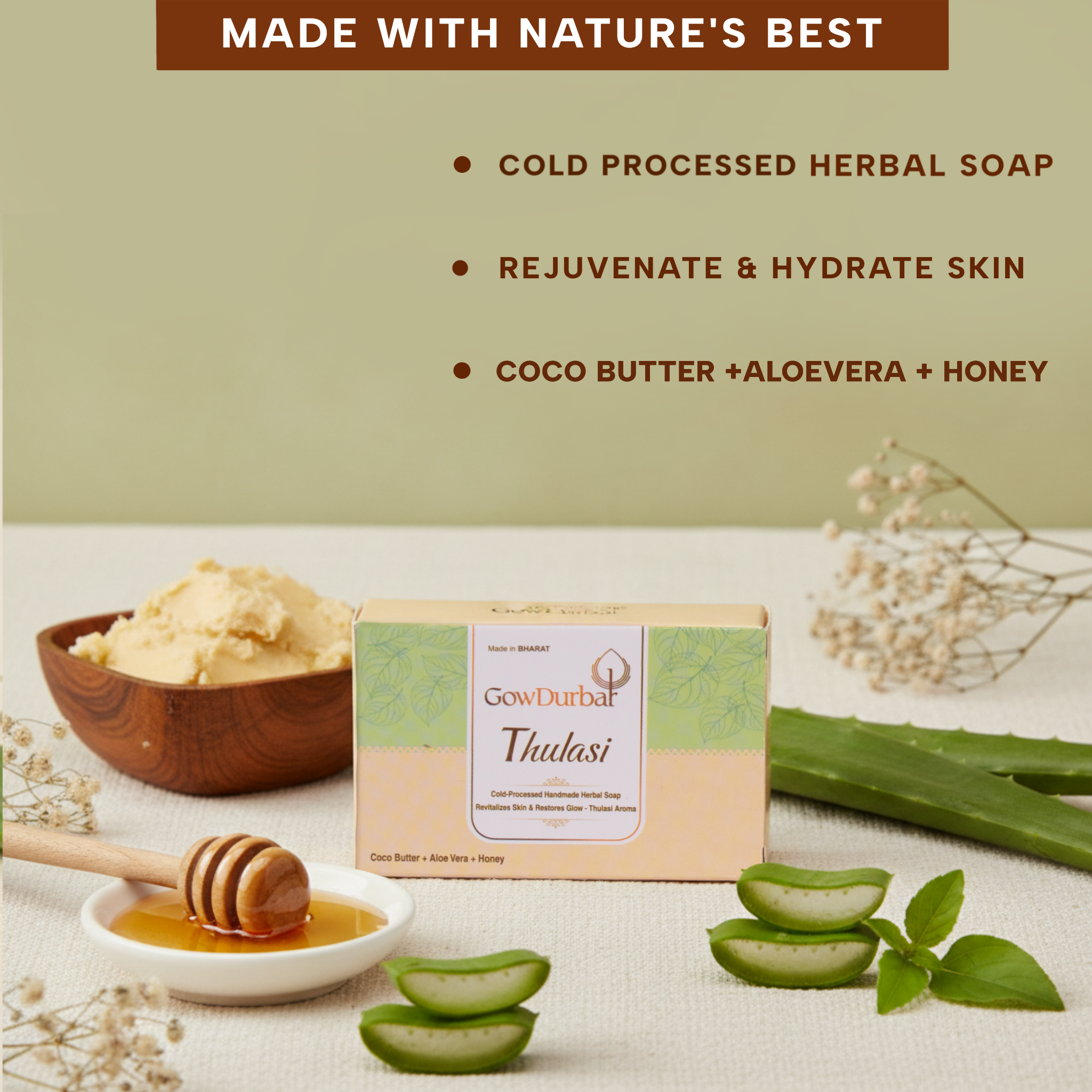 GowDurbar THULASI soap is 100% Ayurvedic cold-processed handmade soap, which is highly enriched with natural ingredients such as cocoa butter, aloe vera, and honey, in addition to essential-oil-based thulasi fragrance. Each and every ingredient has been chosen carefully after years of research to create a one-stop natural and organic solution for all skin types.
