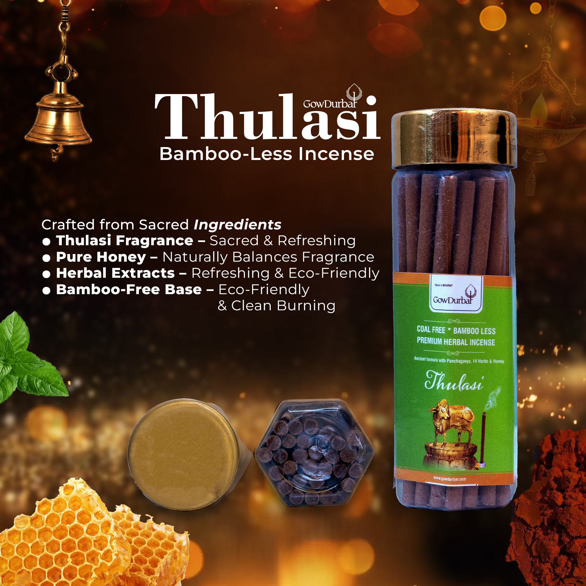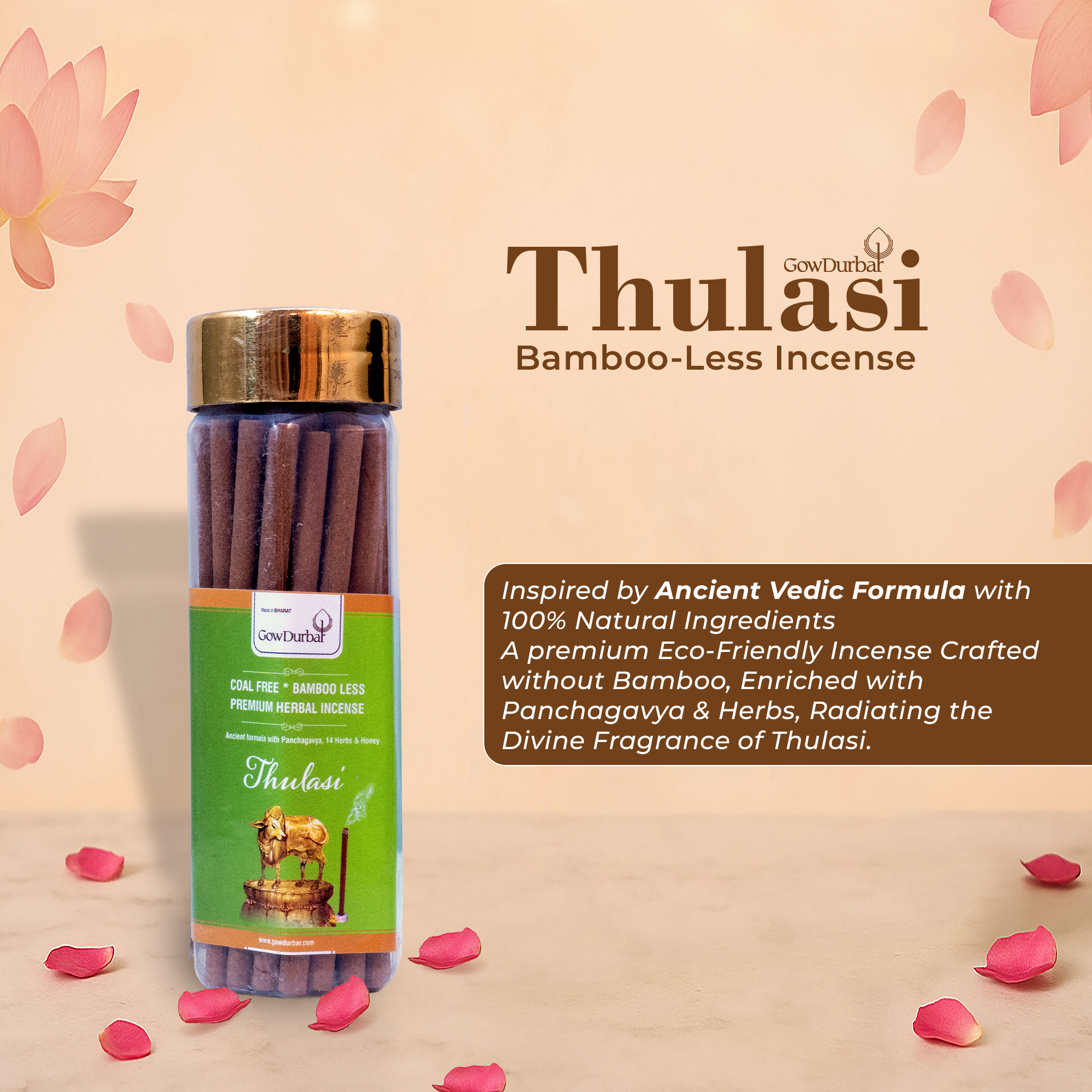 Introducing Thulasi, a premium herbal incense by Gowdurbar. Made without bamboo and completely eco-friendly, it embodies the essence of nature. Infused with Panchagavya and herbal elements, it exudes a unique fragrance that uplifts your surroundings. At Gowdurbar, our soulful mission is to create pure, natural products that resonate with the beauty of the environment and enrich your spiritual experiences.