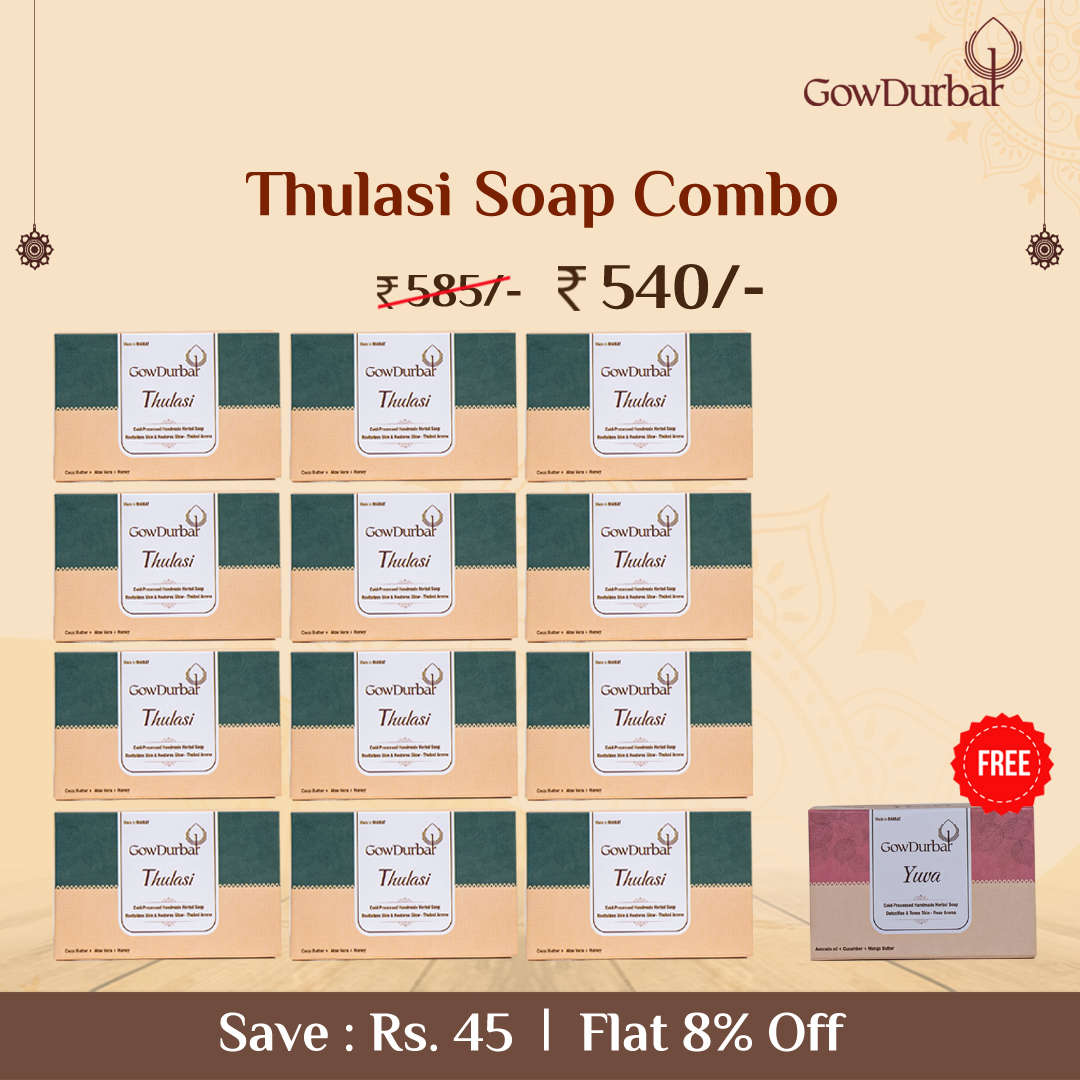 GowDurbar THULASI soap is 100% Ayurvedic cold-processed handmade soap, which is highly enriched with natural ingredients such as cocoa butter, aloe vera, and honey, in addition to essential-oil-based thulasi fragrance. Each and every ingredient has been chosen carefully after years of research to create a one-stop natural and organic solution for all skin types.