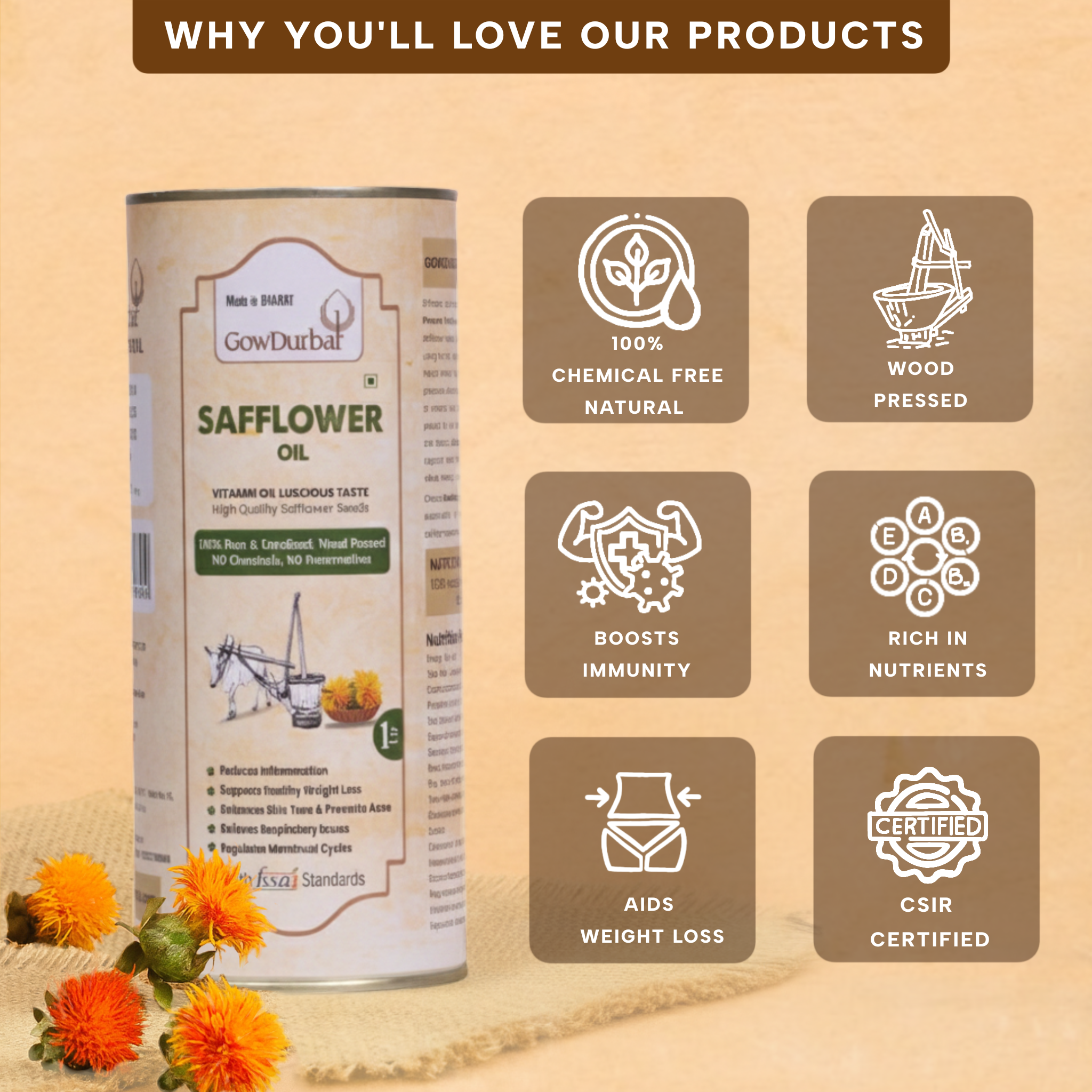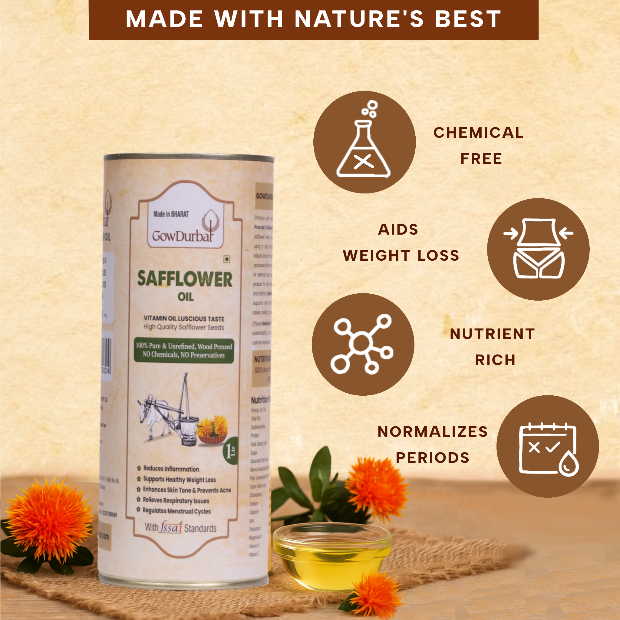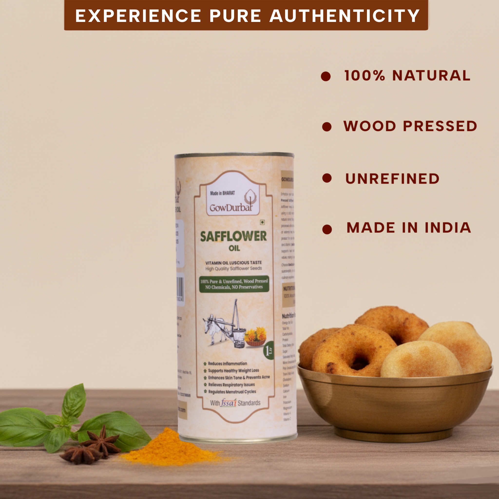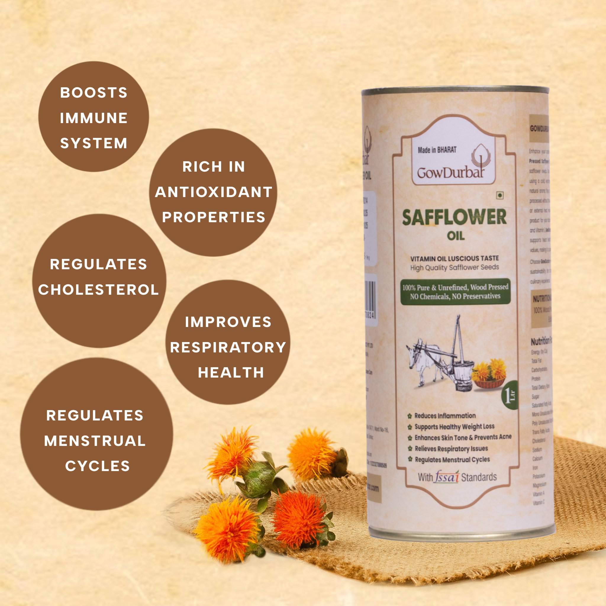 Light, floral, wood‑pressed safflower oil extracted in a slow lakdi‑ghani from carefully chosen seeds, offering a clean, neutral taste, crisp mouthfeel, and high‑heat kitchen performance for everyday Indian cooking from tadkas and sautés to roasts and light frying while remaining 100% unrefined, traditionally filtered, and free from chemical additives. Each batch is positioned around purity, clarity, and sensory consistency across brand pages, with a subtle nutty‑floral note that keeps spices and ingredients at the forefront.